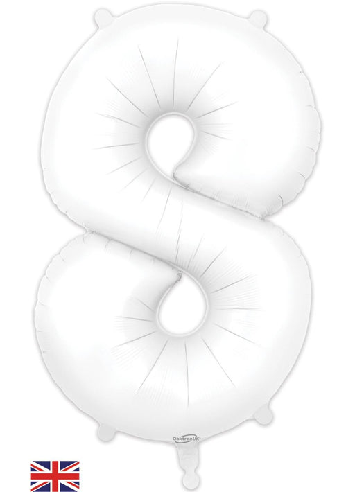 Giant number 8 white super shape foil balloon measuring 34" in height. Click & Collect orders: Balloon supplied inflated with helium. Delive...