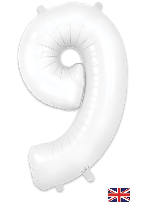 Giant number 9 white super shape foil balloon measuring 34" in height. Click & Collect orders: Balloon supplied inflated with helium. Delive...