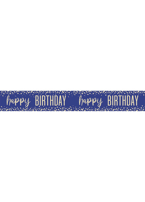 9ft / 2.74m long blue confetti Happy Birthday banner printed one side.