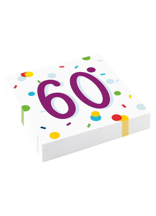 Pack of 20 colourful confetti 60th birthday party napkins.