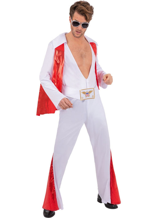 Officially licensed Elvis Presley fancy dress consisting of white all in one jumpsuit with cape. Size Chest Waist Inside Leg Medium 38''-40'' ...