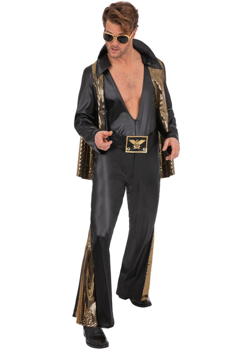 Officially licensed Elvis Presley fancy dress consisting of black all in one jumpsuit with cape. Size Chest Waist Inside Leg Medium 38''-40'' ...