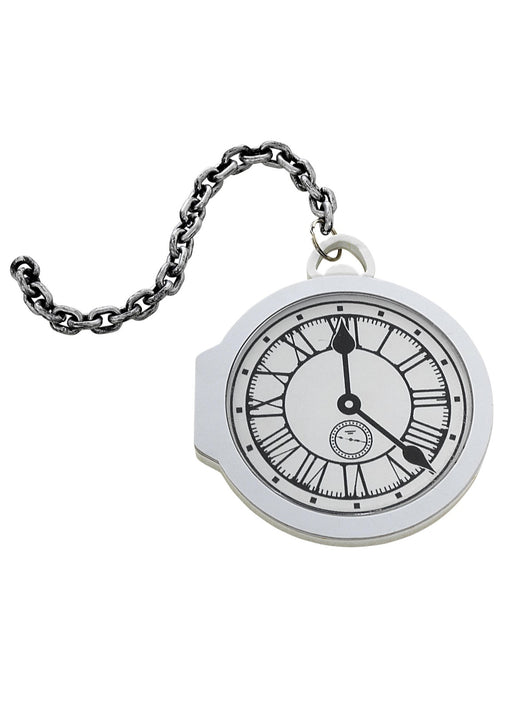 White fake EVA pocket watch on chain fancy dress accessory measuring 15 cm diameter perfect for an Alice In Wonderland theme.