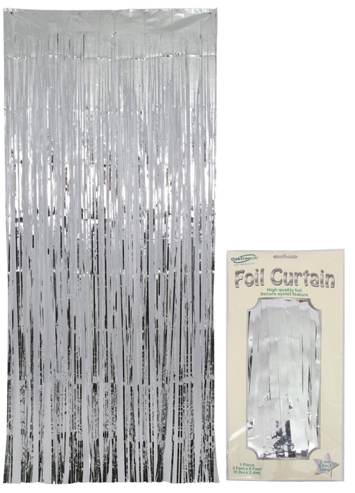 Metallic silver 1 piece foil door curtain measuring 0.9 m x 2.4 m (3 ft x 8 ft).