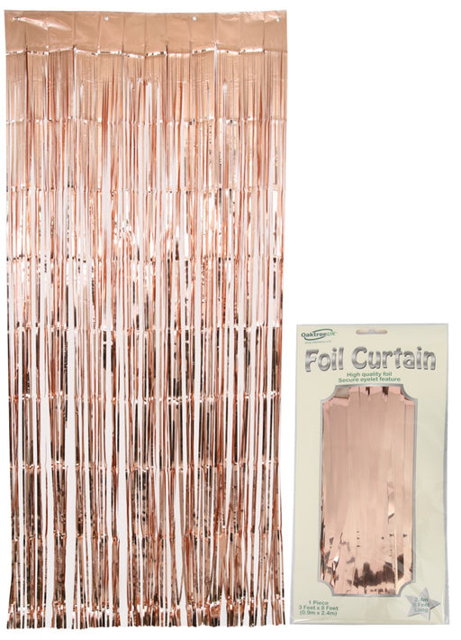 Metallic rose gold 1 piece foil door curtain measuring 0.9 m x 2.4 m (3 ft x 8 ft).