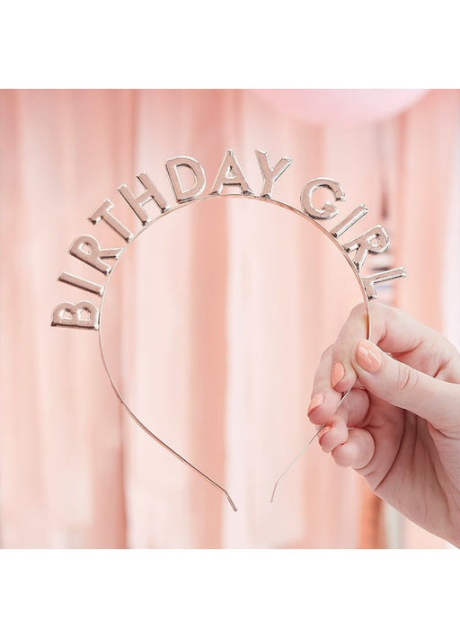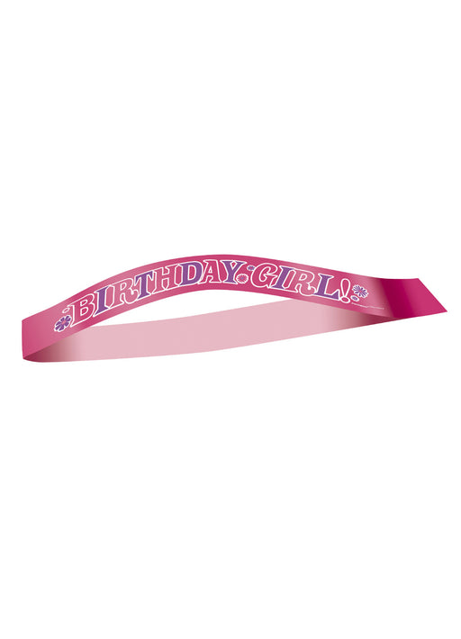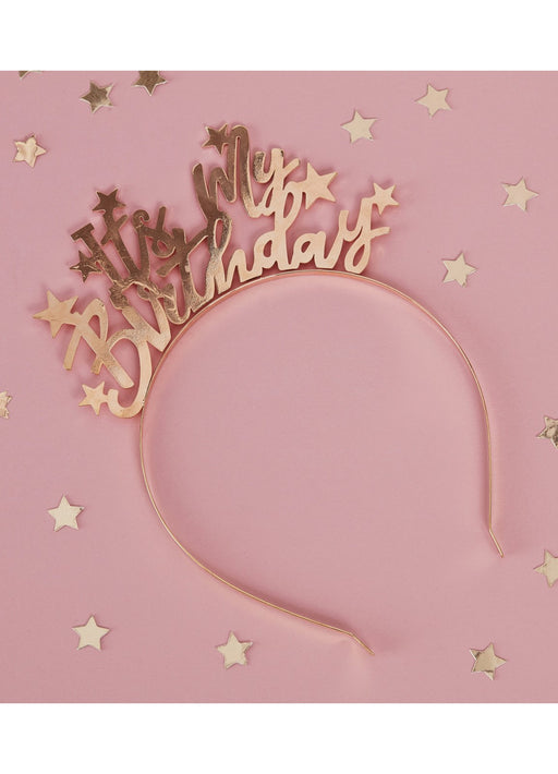 Rose gold foiled It's My Birthday sash measuring 75 cm by 10cm with pink ribbon tie.