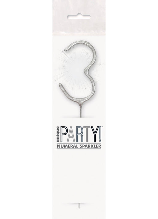Number 8 silver sparkler candle. Ideal decoration for your birthday cake.