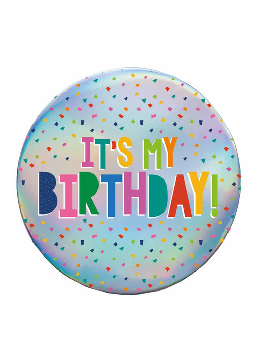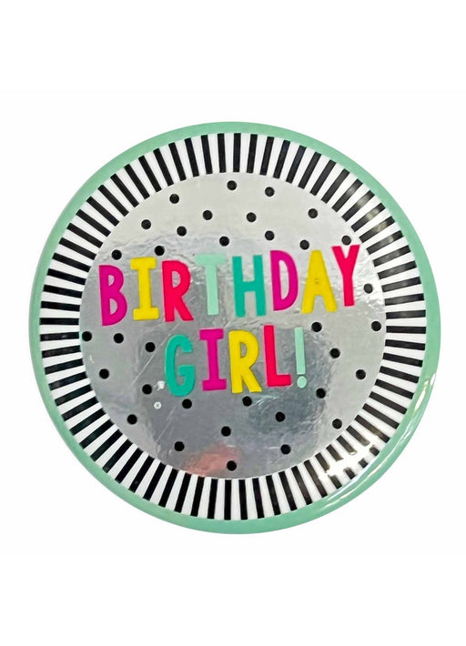 Small "Birthday Girl" badge decorated with silver background with black dots & stripes.