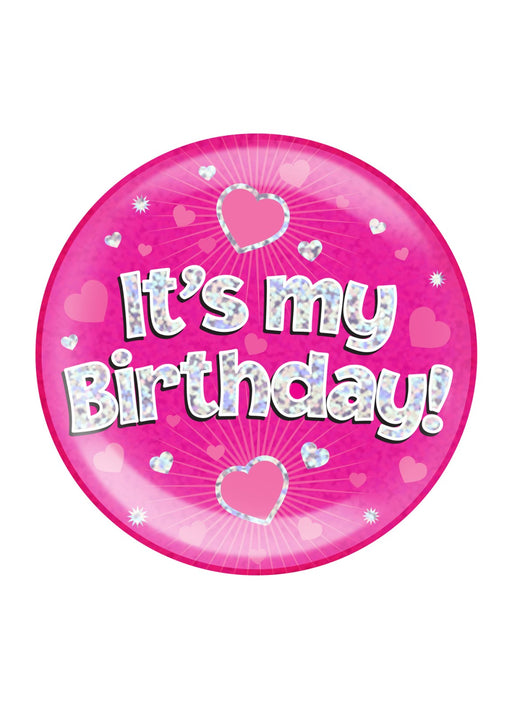 Holographic pink It's My Birthday 15 cm large badge. You can pin it on or stand it up!