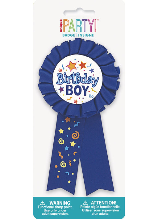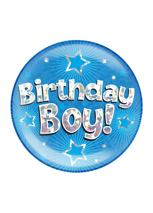 Holographic blue Birthday Boy 15 cm large badge. You can pin it on or stand it up!