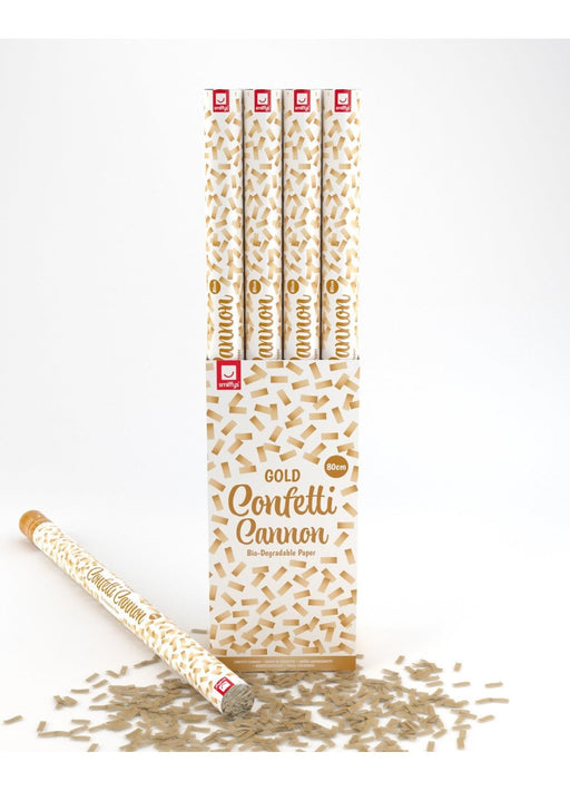 Giant 80cm tall gold confetti party cannon filled with bio-degradable paper.
