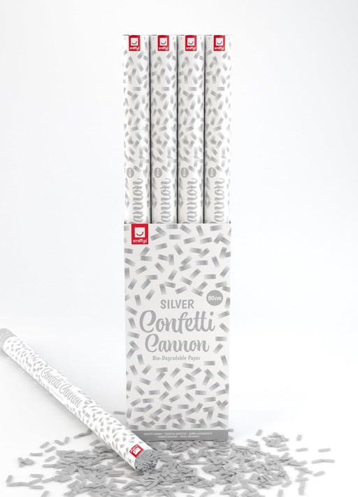 Giant 80cm tall silver confetti party cannon filled with bio-degradable paper.