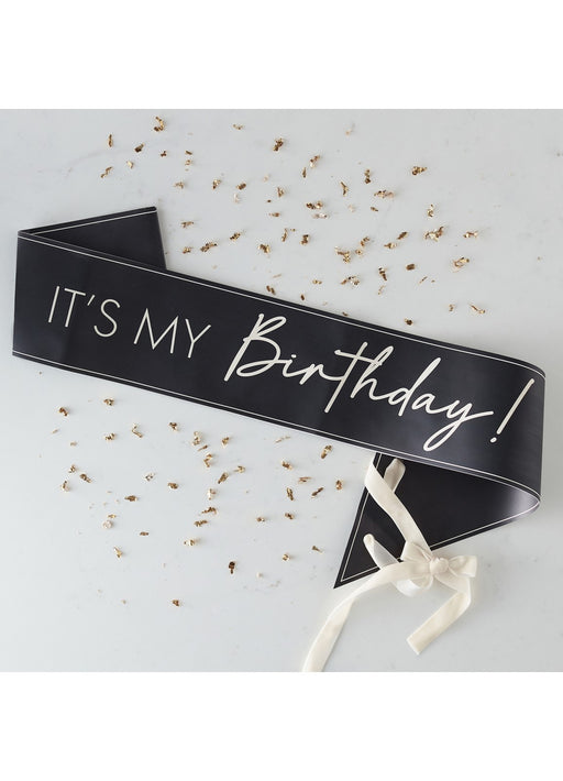 Black stone paper It's My Birthday sash with nude velvet ribbon tie.