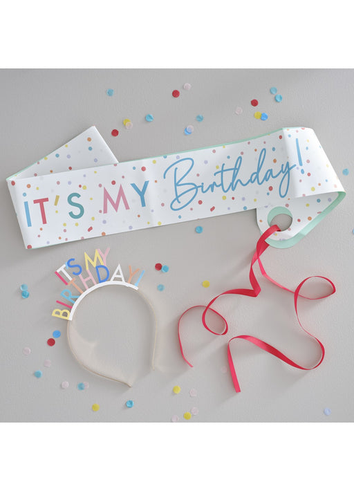 Multi-coloured speckle "It's My Birthday" sash with red ribbon tie and "It's My Birthday" card headband.