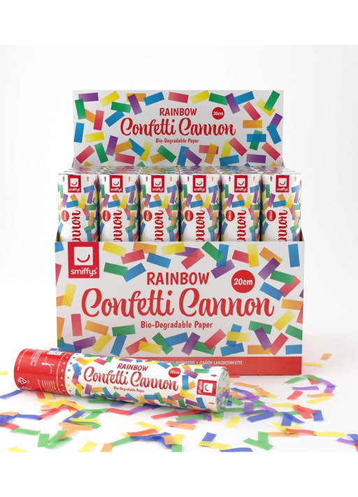 Small 20cm tall rainbow confetti party cannon filled with bio-degradable paper.