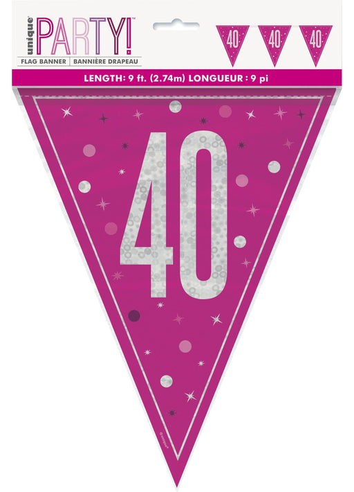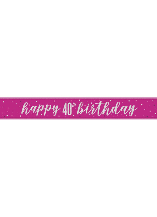 9ft / 2.74m long 40th birthday Pink Glitz banner printed one side.