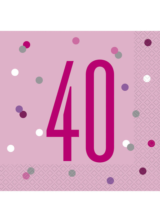 Pack of 16 luncheon 40th Birthday Pink Glitz napkins. 2 ply. 33 x 33cm.