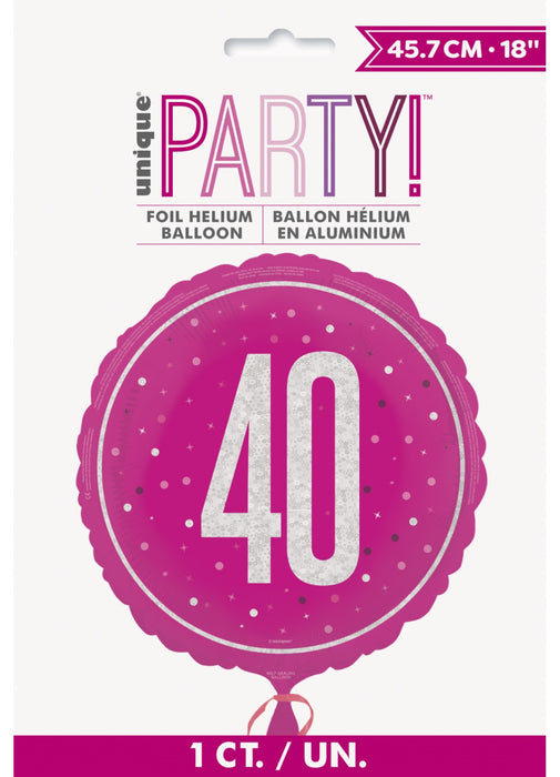 Pink Glitz 40th Birthday 18" circle shaped helium balloon printed both sides.