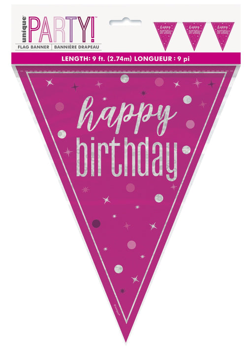 2.74 m/9 ft long Pink Glitz happy birthday plastic bunting.