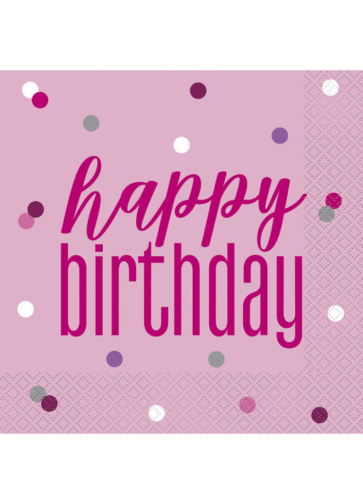Pack of 16 luncheon Happy Birthday Pink Glitz napkins. 2 ply. 33 x 33cm.