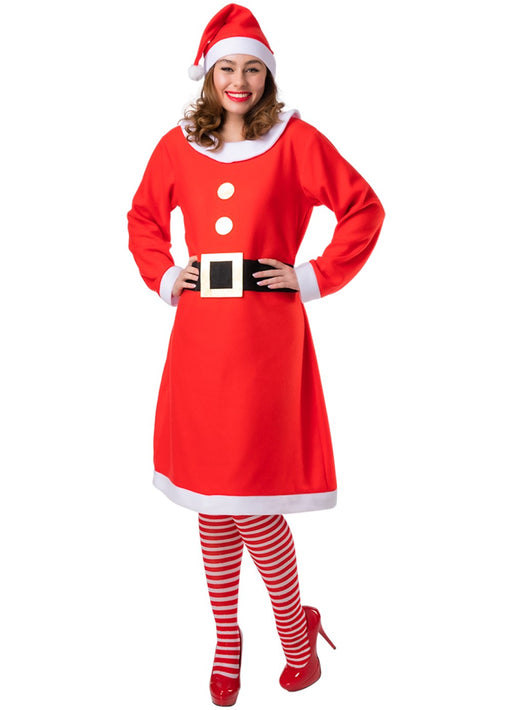 Ladies Santa Claus costume with red dress and attached belt and hat with bobble.