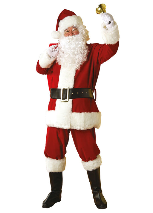 Deluxe plush Santa suit consisting of hat, jacket with front zip, trousers with pockets, belt, gloves and boot tops. Costume Size: Standard (Chest ...
