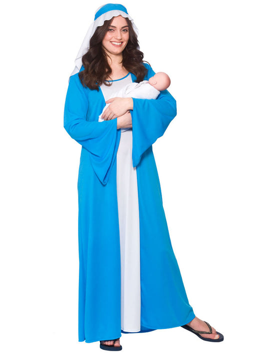 Adult Christmas Nativity Mary costume in two sizes. Includes light blue and white full length dress and headpiece. Baby doll not included. Size ...