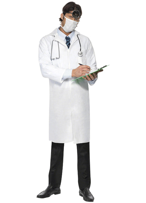 Long white doctor's coat with tie on facemask. Stethoscope is an additional accessory. Size Chest Waist Inside Leg Medium 38''-40'' 32''-34'...