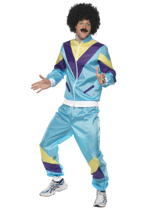 1980s Height of Fashion costume consisting of a blue, purple and yellow shell suit pair of trousers and matching zip up top with white trim. Those ...