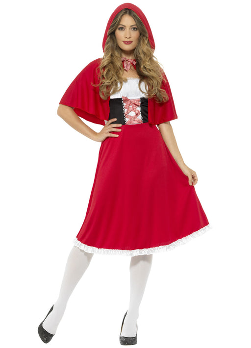 Red Riding Hood fancy dress costume consisting of long red dress with black corset and white trim. Also included is the mini red hooded cape with t...