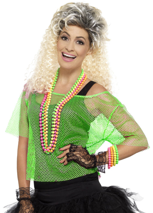 Head back to the 80's with the neon green fishnet top. Size Dress Small/Medium 8-12 Medium/Large 12-16 Large/1X 16-20 Note: Measureme...