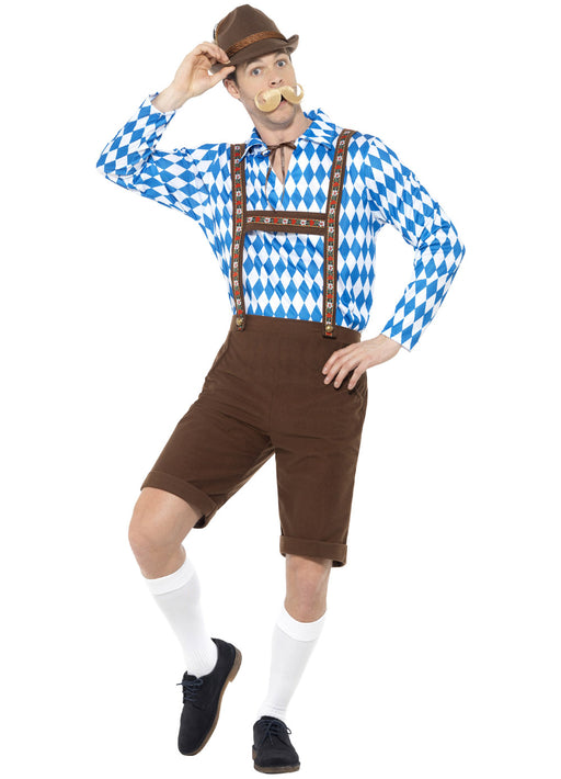 This traditional Oktoberfest Beer Man costume comes with Bavarian flag patterned shirt with brown lederhosen. Hat and moustache are available as ad...