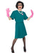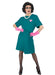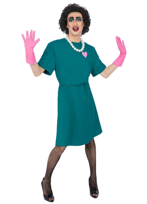 Officially licensed Rocky Horror Show Frank N Furter surgical costume with green gown with pink heart, pair of bright pink gloves and pearl necklace.