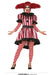 Red and off white striped clown lady costume consisting of dipped hem dress with black trim and baubles along with a collar and pair of matching trousers.