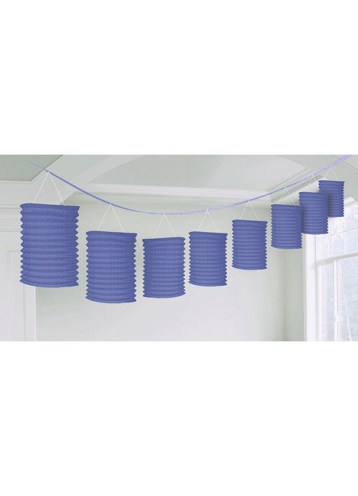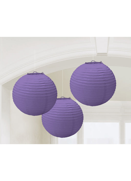Pack of 3 purple hanging paper lanterns measuring 9.5" in diameter. String is included.