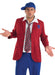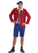 Men's 5 piece School Boy costume consisting of white shirt, maroon coloured blazer with logo, elasticated blue shorts, matching blue cap & maroon and blue striped tie.