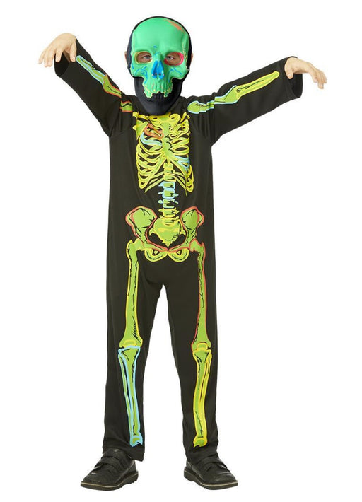 Neon glow in the dark children's skeleton fancy dress costume with all in one printed jumpsuit and mask. Size Age Height Small 4-6 years 115-1...