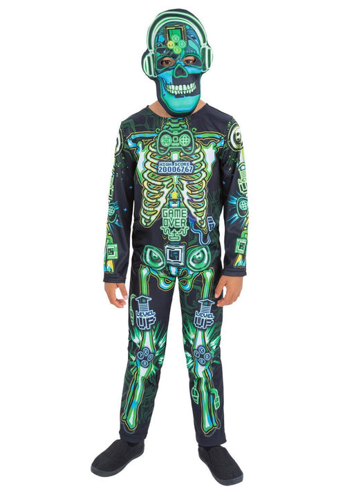 Halloween Gamer skeleton fancy dress outfit with all in one printed jumpsuit and mask. Size Age Height Small 4-6 years 115-128cm Medium 7-9 ...