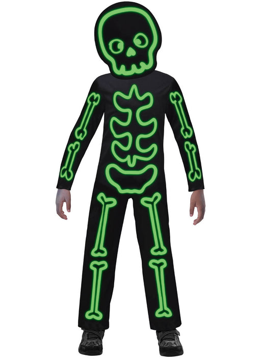 Children's glow in the dark Halloween skeleton costume in black and green with all in one jumpsuit and over sized face mask. We love this one! S...