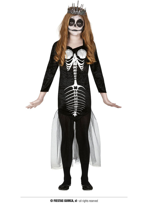 Mermaid skeleton costume with printed bone black dress finished with glittered netting at the bottom. Costume pack does not include pictured crown.