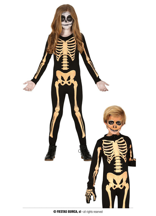 Children's Halloween skeleton costume available in 4 sizes with all in one black jumpsuit with gold skeletal print.