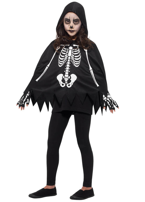One size fits most child size black and white skeleton poncho with hood and pair of matching gloves.