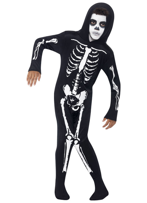 Hooded all in one child's Halloween costume consisting of printed skeleton design jumpsuit. A value for money outfit!