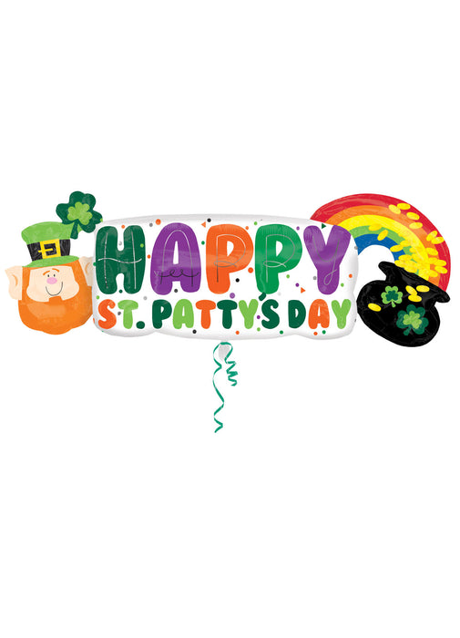 Happy St Patrick's day super shape foil balloon decorated with leprechaun & pot of gold measuring 42" x 15".