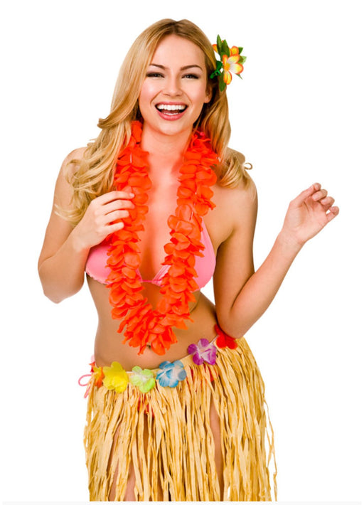 Hula honey Hawaiian instant kit adult consisting of elasticated orange grass skirt, multi-coloured flower headband, wrist cuffs and leis. Also incl...