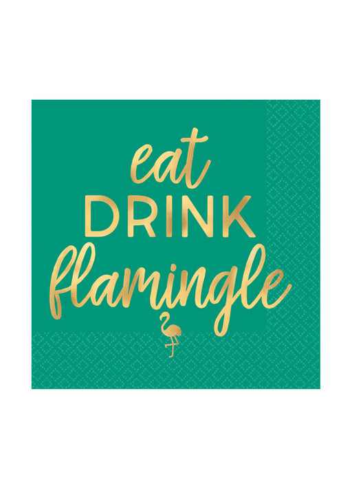 Pack of 16 premium Eat, drink, flamingle green and gold beverage napkins.