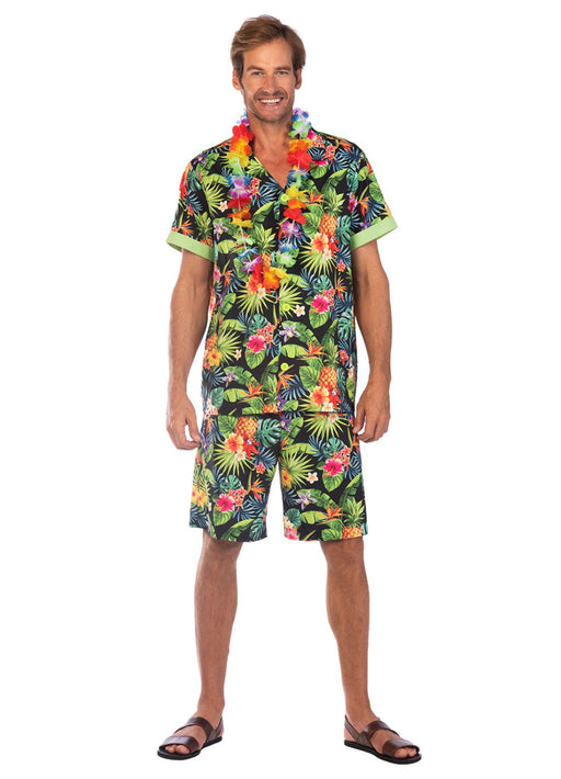 Hawaiian men's costume set with tropical luau themed black shirt and shorts along with multi-coloured lei. Size Chest Waist Standard 106 cm 91...