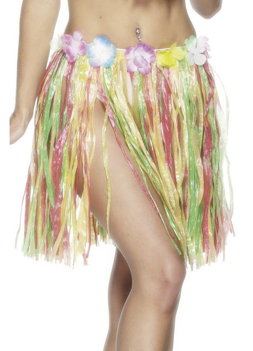 Multicolour 46cm long Hawaiian Hula skirt with an elasticated waist. Would fit a dress size 8 to 12.