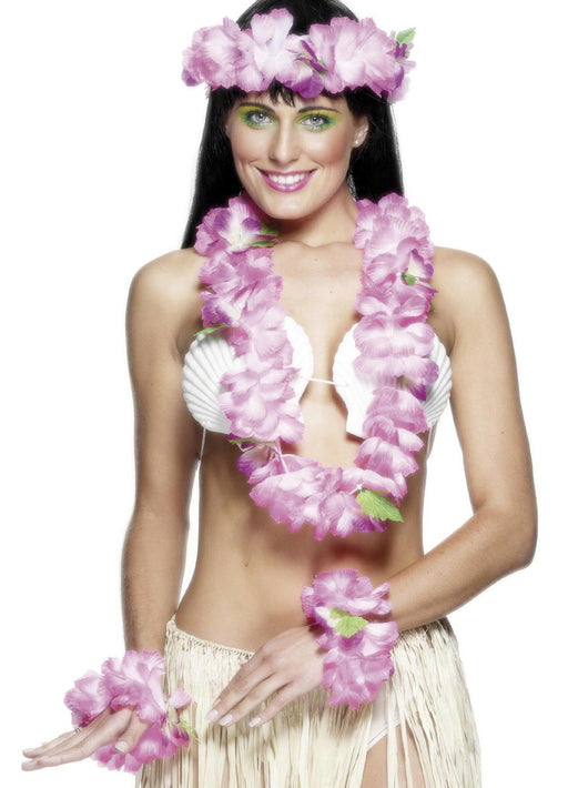 This pink Hawaiian set includes matching leis, headband and wristbands.