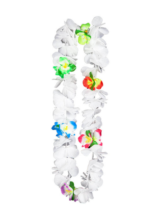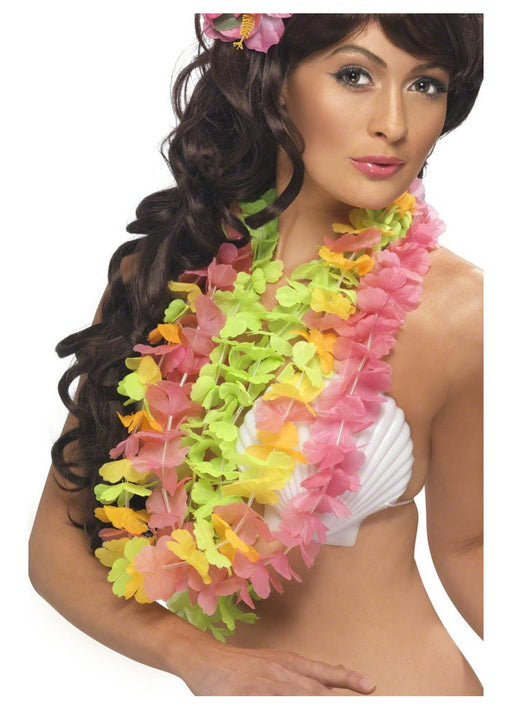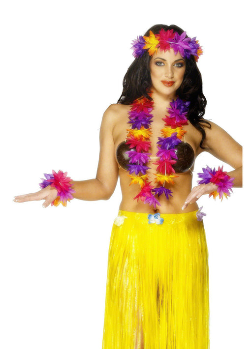 This multicoloured Hawaiian set includes matching leis, headband and wristbands.